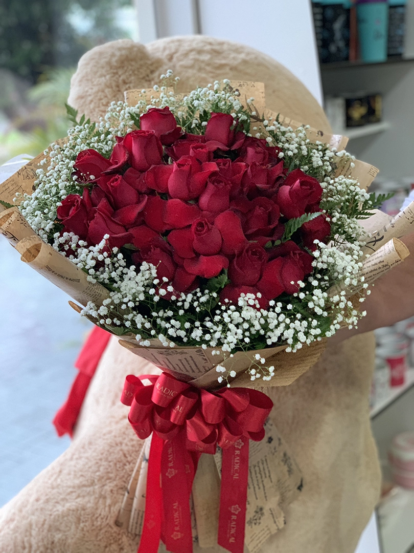Tamanho G composto por 24 rosas mais gipsofila (mosquitinho)