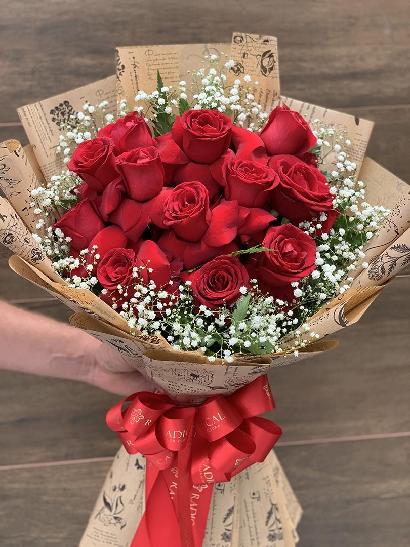 Tamanho M composto por 12 rosas mais gipsofila (Mosquitinho)